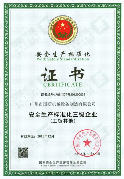 2012年12月24日,国家安全生产监督管理总局为milan体育公司颁发了《安全生产标准化企业证书》,这意味着我司已达到《广州市工业企业安全生产标准化评定办法》及《广州市工业企业安全生产标准化评定标准》的要求。