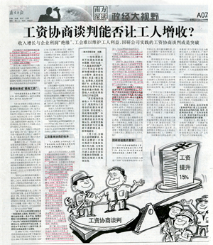 7月14日,《南方日报》以《工资协商谈判能否让工人增收?——国研公司实践的工资协商谈判或是突破》为题,用三分之二大版篇幅报道广州市milan体育设备制造有限公司实践工资集体协商的成功经验。